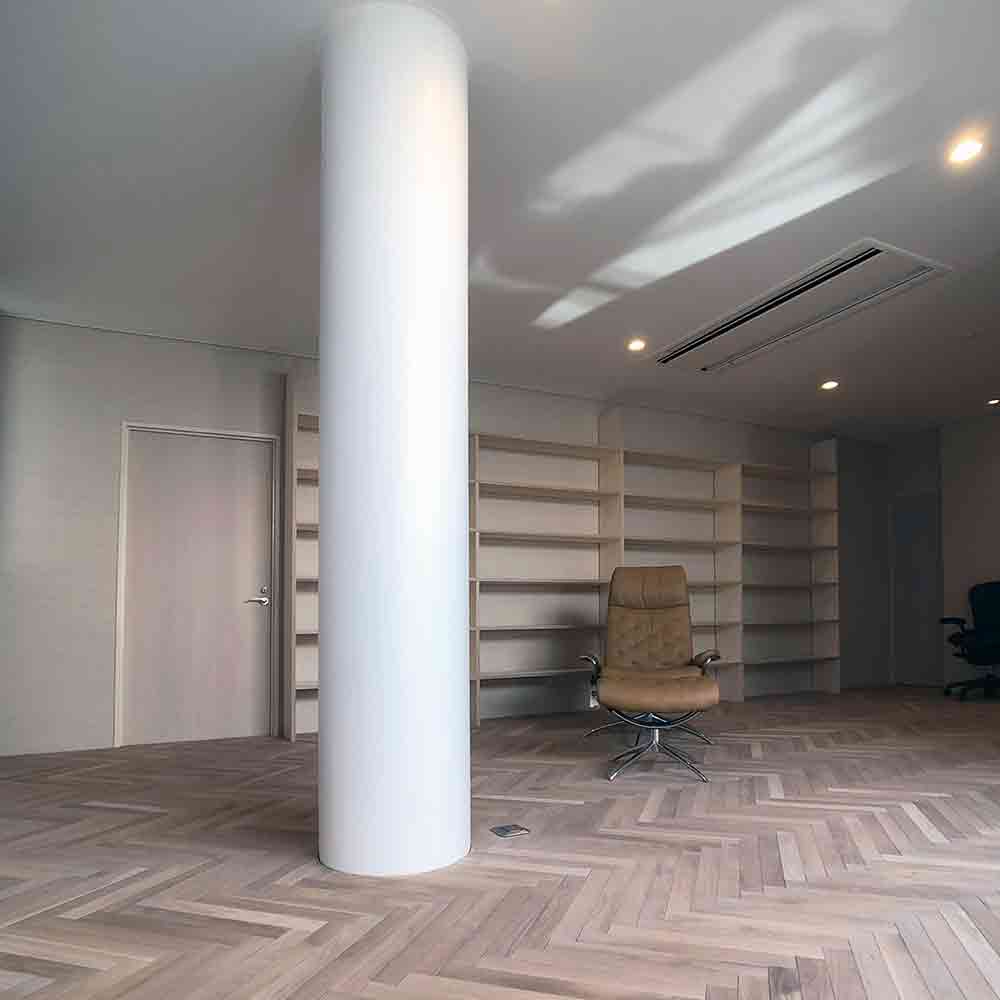 ナラ無垢材の床材はヘリンボーンパターン貼りです。
